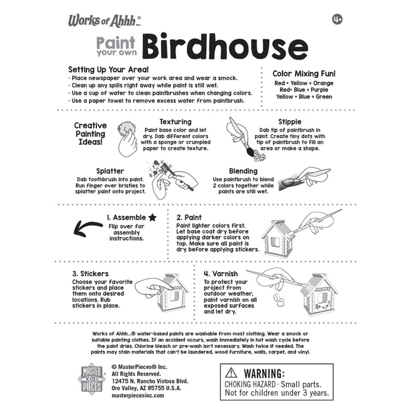 This Birdhouse Buildable Wood Craft & Paint Kit is made of real wood, and includes everything you need to create a beautiful work of art! The Birdhouse Wood Craft & Paint Kit is the perfect gift for every art loving kid! It includes 1 unassembled wood birdhouse, 1 sticker sheet, 1 non-toxic varnish, 4 non-toxic acrylic paint tubs, 1 artist-quality paintbrush, and 1 instruction sheet with painting and building guide.