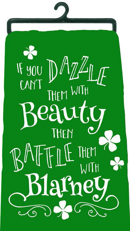 Embrace the luck of the Irish with our whimsical “If You Can’t Dazzle Them with Beauty, Then Baffle Them with Blarney” flour sack towel! Perfectly sized at just over 26 inches square and crafted from 100% cotton, this towel is both functional and fabulous. It adds a splash of vibrant green and a dash of humor to your kitchen, making it an ideal companion as you whip up those festive recipes for St. Patrick's Day or any occasion that calls for a bit of fun!