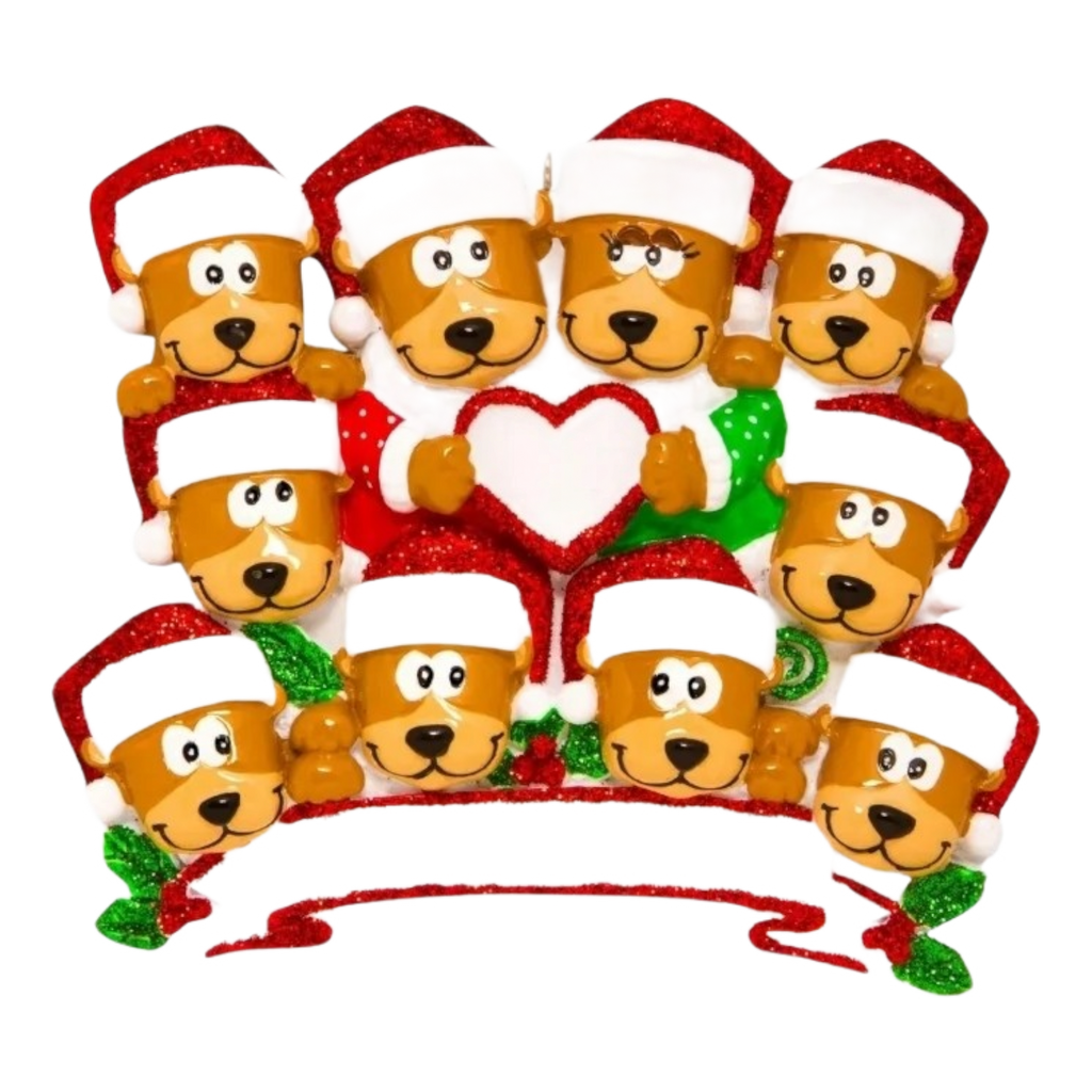 Capture the heartwarming joy of the holiday season with this adorable family ornament featuring ten festive bears. Each bear is cheerfully dressed in bright holiday attire, with Santa hats and scarves, and they all come together to hold a central heart, symbolizing love and togetherness. The vibrant colors, glittering accents, and charming expressions make this ornament a perfect representation of family unity and festive cheer.