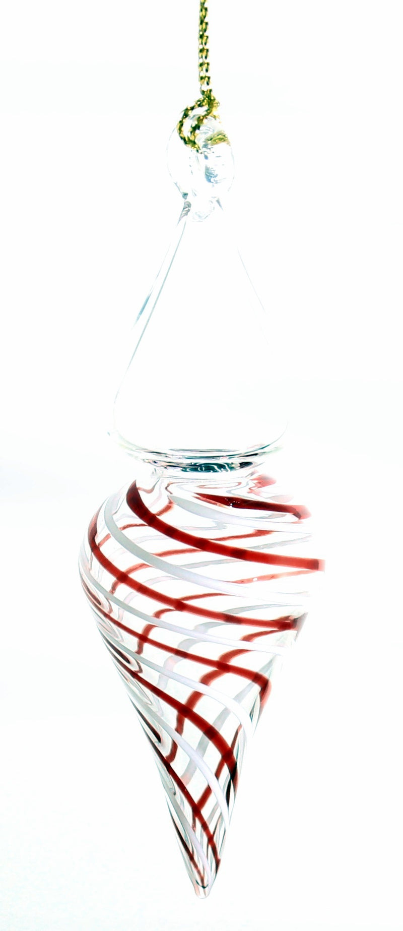 Bring a twist of classic holiday cheer to your tree with this Candy Cane Twist Finial glass ornament. Handmade from mouthblown German Pyrex glass in Egypt, this elegant finial ornament measures just over 4 inches long and beautifully showcases spiraling red and white stripes, reminiscent of traditional candy canes. Its graceful finial shape adds a sophisticated flair while maintaining a playful festive spirit.