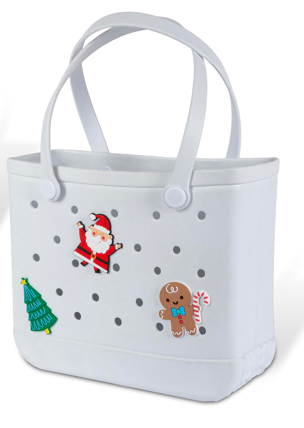 Get ready to add some festive flair to your outings with the Charming! Seasonal Tote Bag! Measuring 14.25 inches long, 4.75 inches wide, and 11.75 inches high, this stylish yet practical silicone tote is perfect for carrying everything from groceries and gifts to beach essentials and craft supplies. With its cheerful white design and playful perforations, this tote is not only functional but also eye-catching, making it a great accessory for any season or occasion.