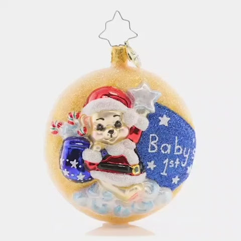 Celebrate your little one's first Christmas with this cherished crescent-moon Little Gem. A baby-bear with a Santa hat is the star of this sweet keepsake piece.