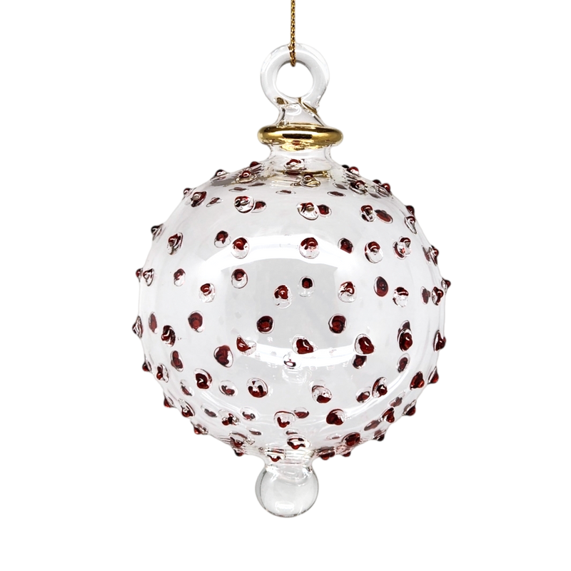 Adorn your holiday decor with this delightful Clear Glass Stipple Ball in Red. This charming ornament is handcrafted using traditional glassblowing techniques that emphasize both artistry and precision. Each almost 3-inch sphere is embellished with striking red stipple dots, creating a playful yet sophisticated design that sparkles with festive cheer.