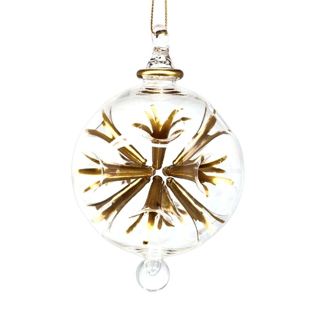 Transform your holiday decor with the radiant elegance of the Pierced Glass Ball in Gold. This breathtaking ornament is meticulously handcrafted from premium Pyrex, featuring a striking design that combines traditional glassblowing techniques with exquisite modern artistry. Measuring almost 3 inches in diameter, it seamlessly blends sophistication and festivity with its vibrant gold accents swirling within the clear glass.
