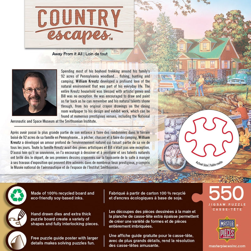 This MasterPieces 24" x 18" 550pc Puzzle was painted by William Kreutz. Spending most of his boyhood trekking around his family's 92 acres of Pennsylvania woodland… fishing, hunting and camping, William developed a profound love of the natural environment that was part of his everyday life. To reduce its impact on our environment, the chipboard used in this puzzle is made of recycled material.
