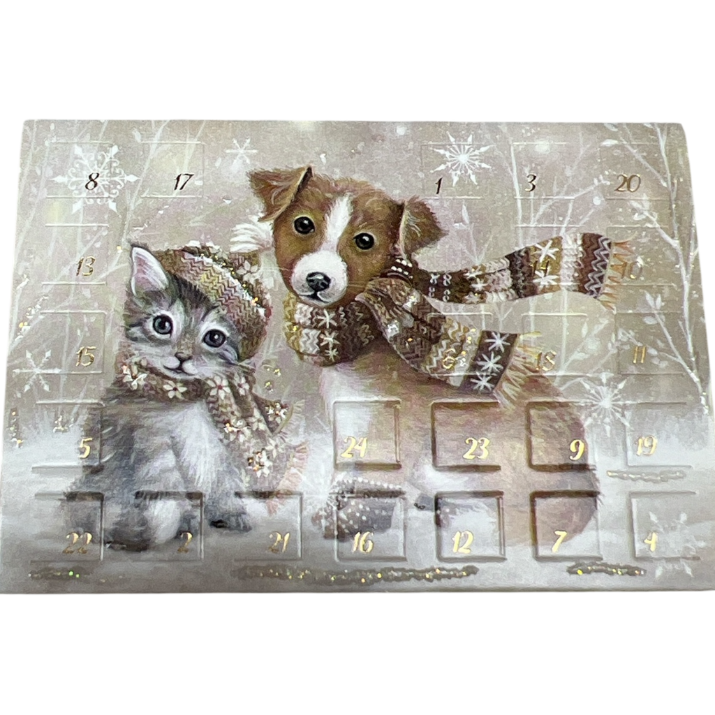 Add a touch of warmth and cuteness to the holiday season with this miniature Advent calendar card, featuring an adorable duo of a kitten and puppy dressed snugly in winter scarves and a knit hat. The soft, neutral-toned background with sparkling snowflakes sets a peaceful, wintry scene, evoking the simple joys of cozy companionship during the festive season. This charming image is sure to bring smiles and a feeling of comfort to anyone receiving it.