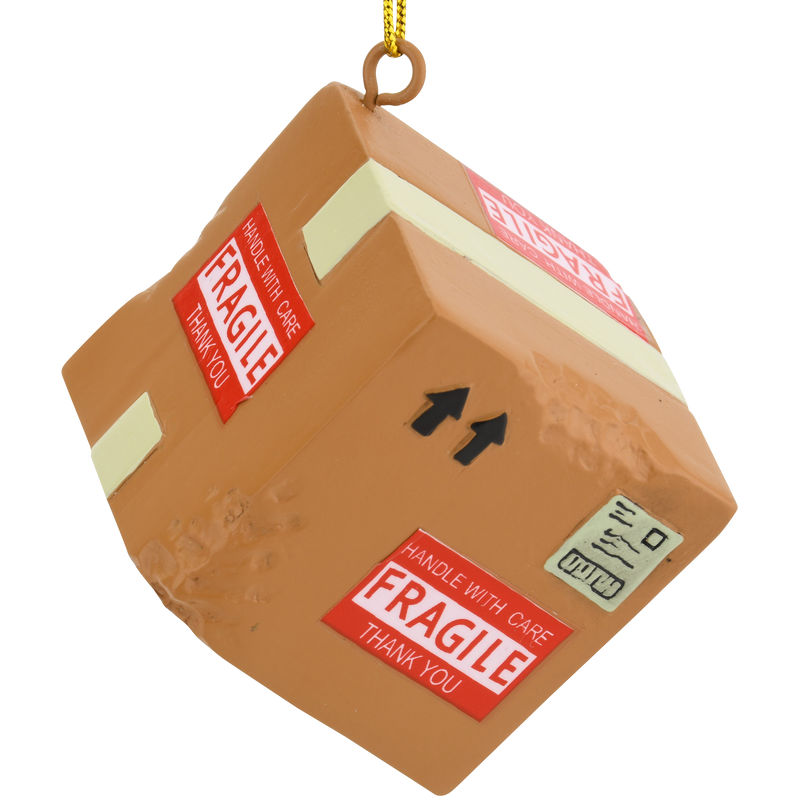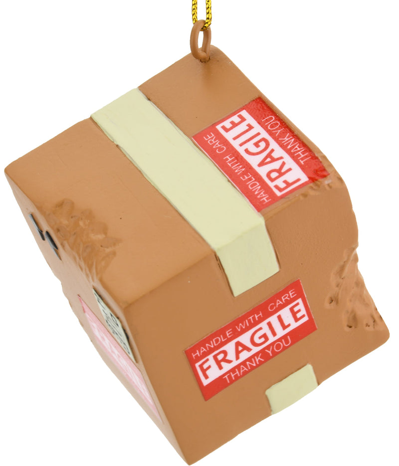 This ornament is sure to hit home with a lot of Christmas shoppers. Too often during the holiday season you receive a package that looks like it was thrown down a flight of stairs. This Fragile box has the stickers all over it and the this side up arrows. You can also see the shipping label and packaging tape.