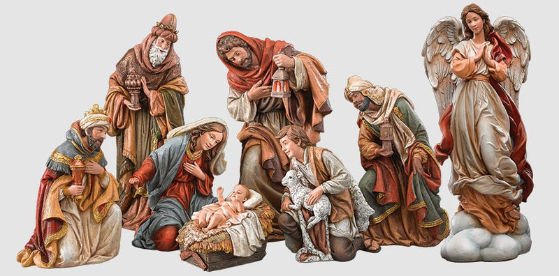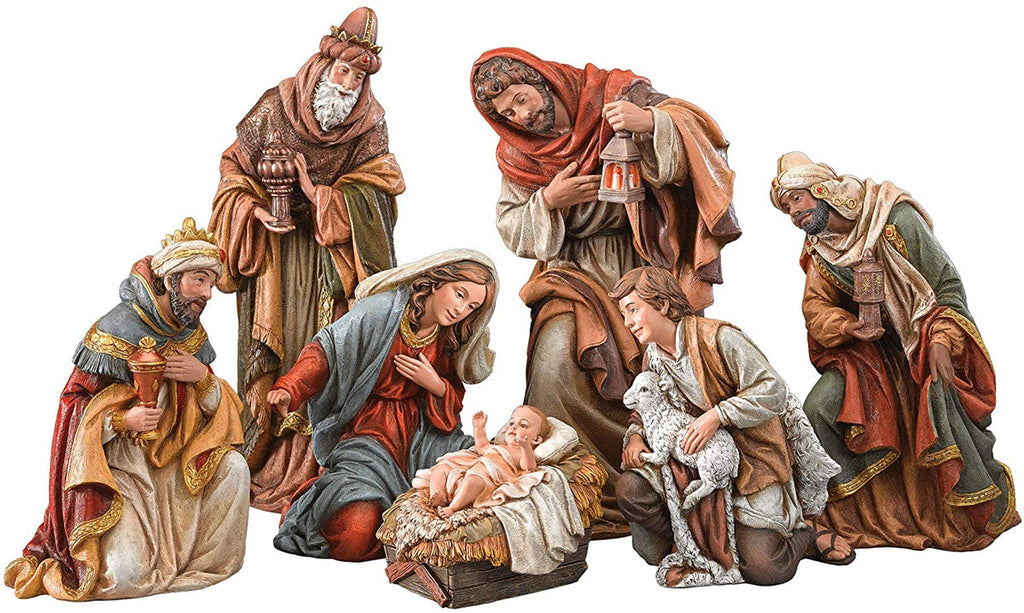 This is a beautiful and realistic nativity set with the largest figures standing 17 inches in height. The 7 piece set includes: