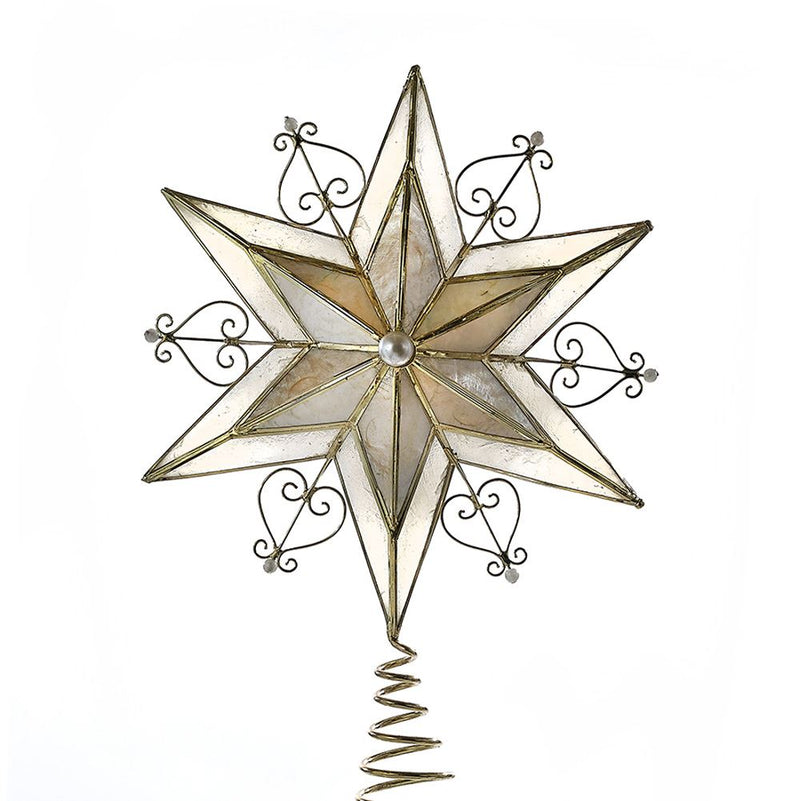 Add the perfect finishing touch to your Christmas tree with this 11-inch capiz scroll star treetop from Kurt Adler. Its double 6-point star design has a smoked capiz effect with faux pearl accents and a brass plated finish. Its coil base attaches securely to the top of your tree.