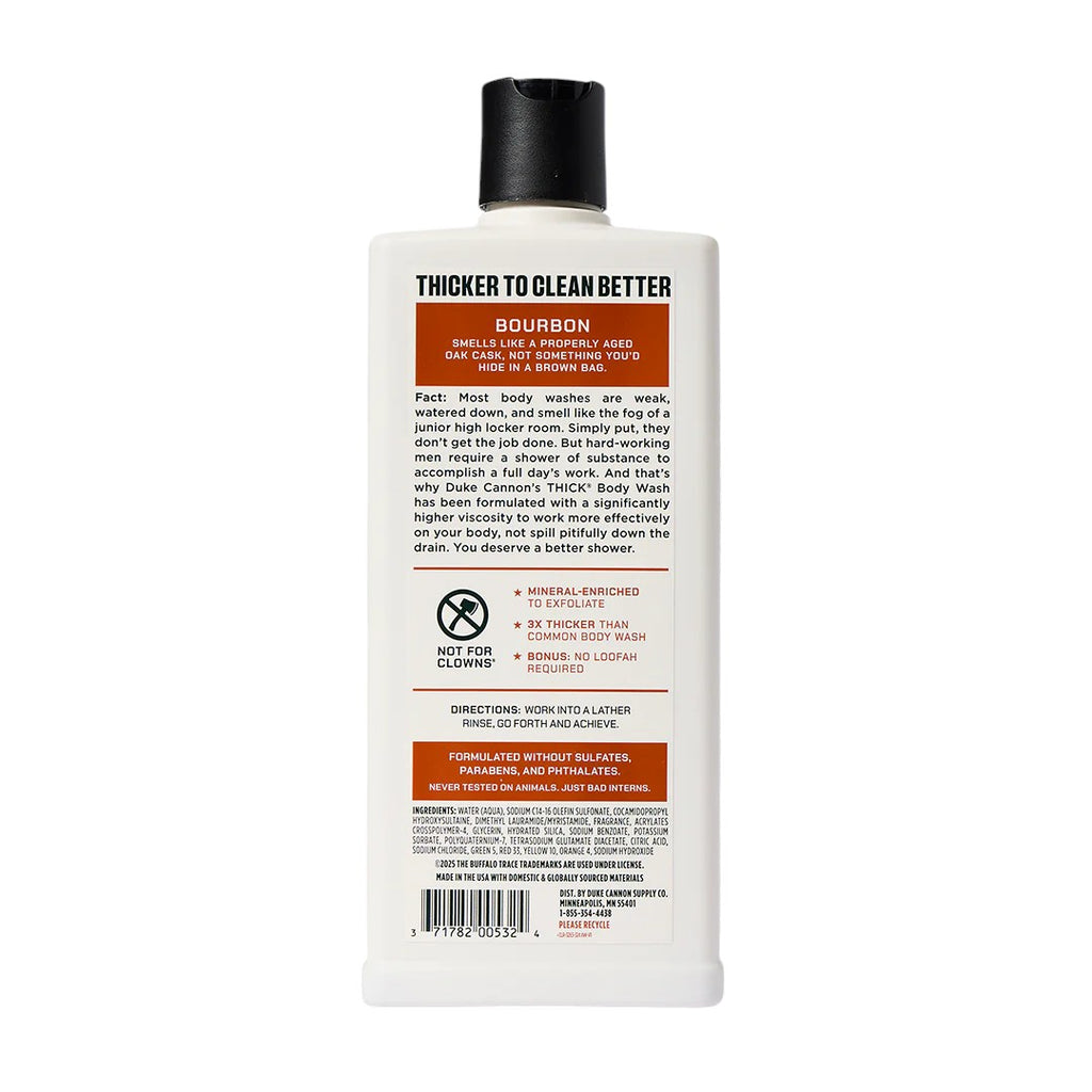 Elevate your shower experience with Duke Cannon's Thick Body Wash inspired by Buffalo Trace Bourbon! This unique body wash combines a rugged, manly scent with a formula that’s been expertly crafted to stand up to even the toughest grime. Designed with the modern man in mind, this body wash offers a thick, lathering consistency that truly sets it apart from standard washes. Say goodbye to flimsy soap options—this 18 oz bottle delivers a robust cleansing experience that smells great and feels even better.
