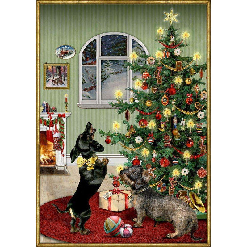 German Advent calendar with an old-fashioned Victorian Home complete with a tree and two Pups standing guard.