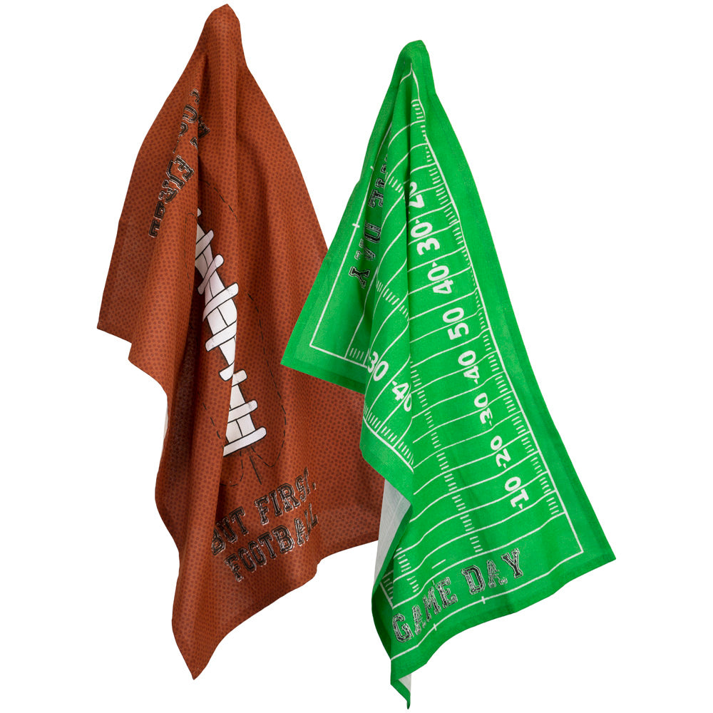 Be ready for clean-up on game day with this Football Fever kitchen towel set. One with a football print design and one with a football field print complete with yard markers.