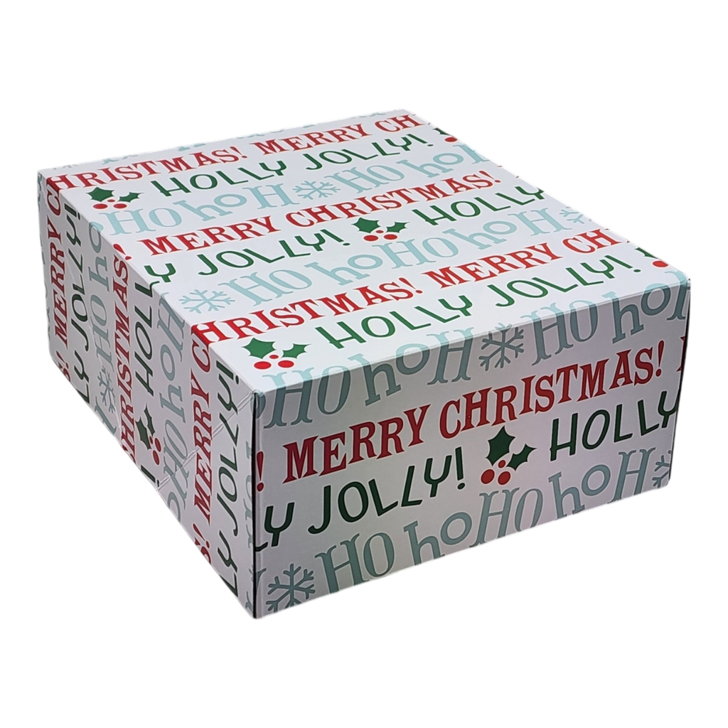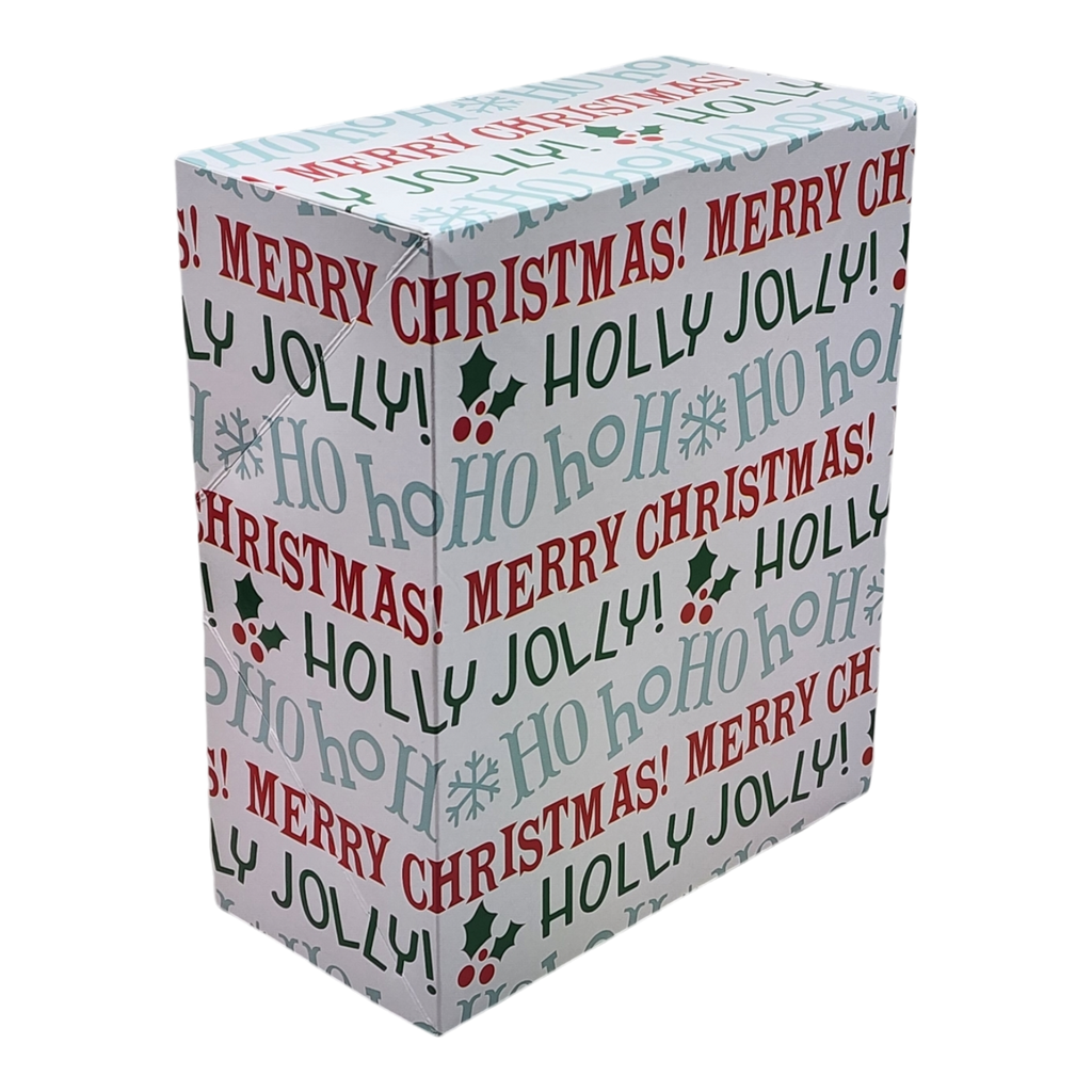 Brighten your holiday celebrations with our festive set of two gift boxes! Each box measures 8.25 inches by 7 inches by 3.5 inches and features a spirited design that exclaims "Merry Christmas!" and "Ho Ho Ho!" in cheerful red and green lettering. Accented with playful snowflakes and holly, these boxes embody the joy and merriment of the holiday season.