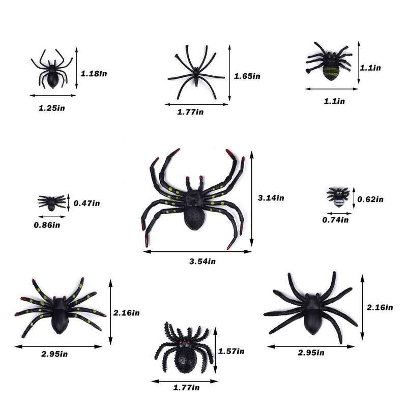 Can be used both indoors and outdoors; Comes with 9 different types of creepy-crawly spiders in an array of sizes, the smallest spider is approximately 0.86’’ x 0.43’’ and the largest one measures 3.11’’x 1.85’’