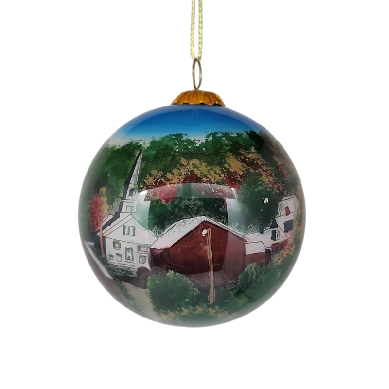 Capture the charm and beauty of Vermont with our exquisite handpainted glass ornaments, featuring beloved landmarks like the quaint Vermont villages. Each 3-inch globe is meticulously handpainted from the inside, ensuring that no two ornaments are exactly alike, making each piece a unique work of art. These ornaments are crafted from real glass, showcasing intricate details and vibrant colors that bring a touch of Vermont’s picturesque scenery to your holiday décor.
