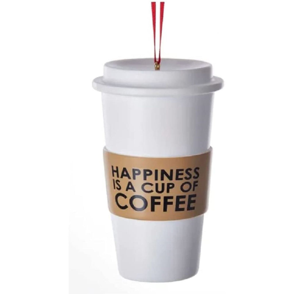 Celebrate the coffee lover in your life with this coffee cup ornament from Kurt Adler. It features a white cup with saying " Happiness Is A Cup Of Coffee" and a red ribbon hanger.