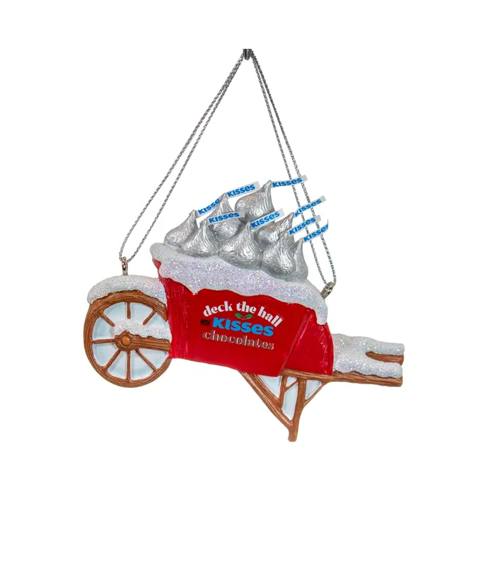 This Hershey's™ Kisses wheelbarrow ornament from Kurt Adler are a fun and festive addition to any holiday décor or Christmas tree. It features a red "Merry Kissmass" wheelbarrow filled with glittered snow and silver Hershey's™ Kisses.