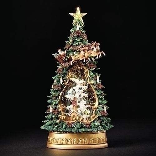 Roman Holiday Village Tree And Church LED Swirl Water Globe.Beautiful and intricately detailed depiction of a winter village scene with Santa Claus and his reindeer ascending on a winter scene. Perfect for displaying on a shelf or mantel.