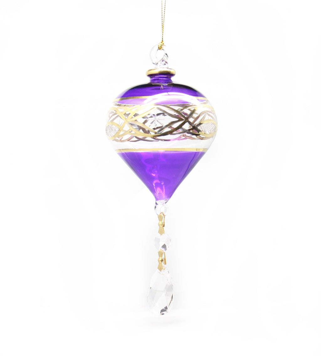 This stunning ornament combines the classic elegance of a handblown glass bauble with the sparkle of hanging crystal droplets. Crafted from German Pyrex glass in Egypt, it’s painted in a regal violet hue and oven-baked to seal in its vivid color. A band of intricate engraved scrollwork wraps around the clear midsection, while real 24K gold rings accent both the top and base, adding a touch of opulent warmth. Two faceted crystal drops linked by gold-tone connectors hang beneath, catching and refracting tree lights for an almost chandelier-like glow.
