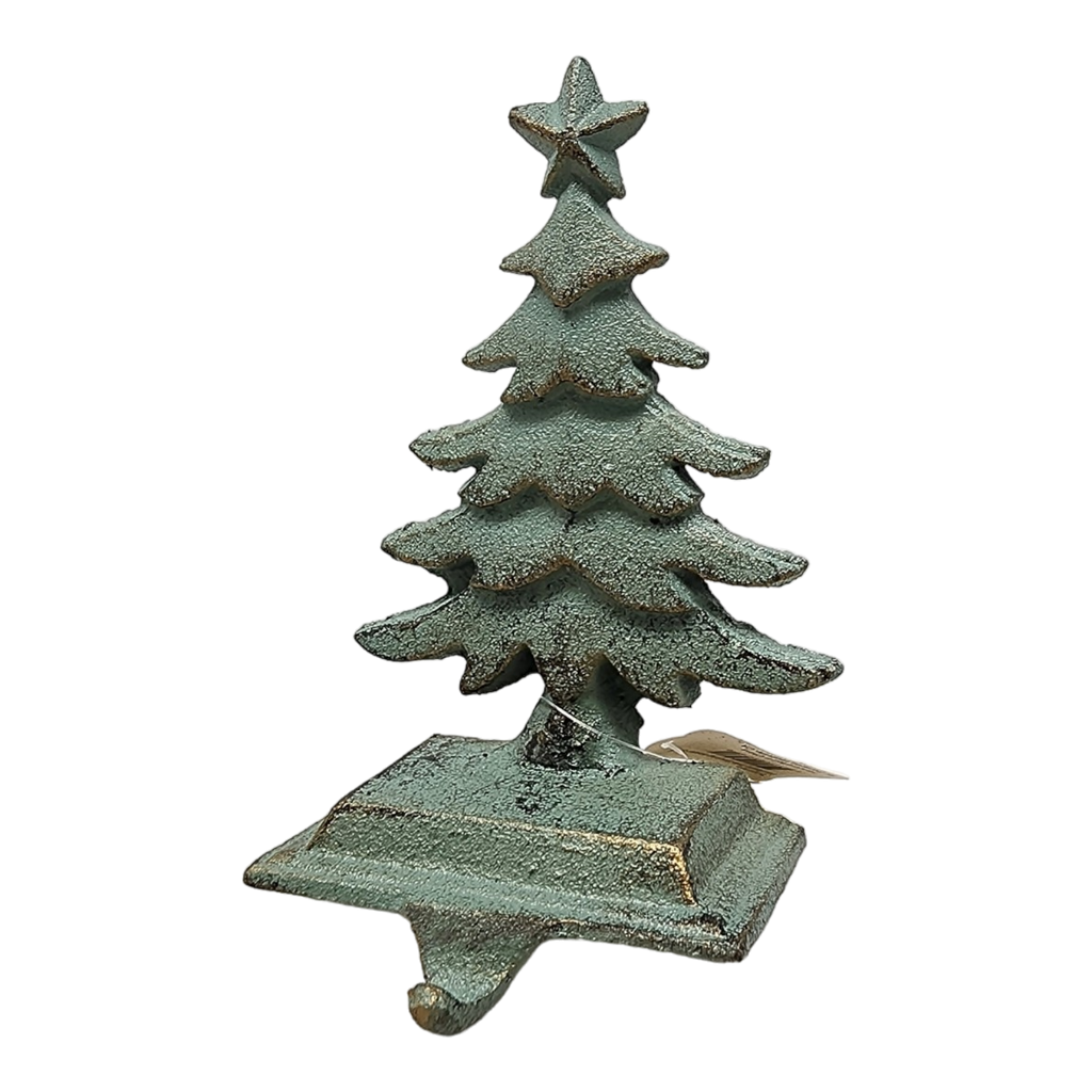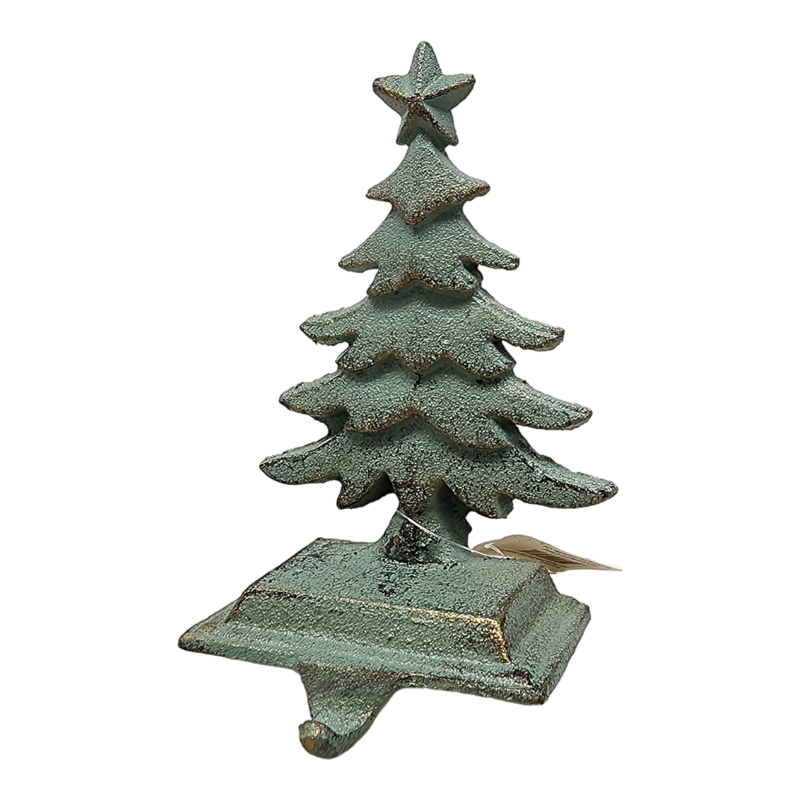Adorn your home with rustic elegance this holiday season using this charming Christmas Tree stocking holder. Made from durable cast iron this sturdy holder ensures your stockings stay securely in place even when filled with holiday goodies. Designed to resemble a beautifully detailed Christmas tree complete with a star on top its intricate craftsmanship and timeless design add a touch of vintage charm to your holiday decor.