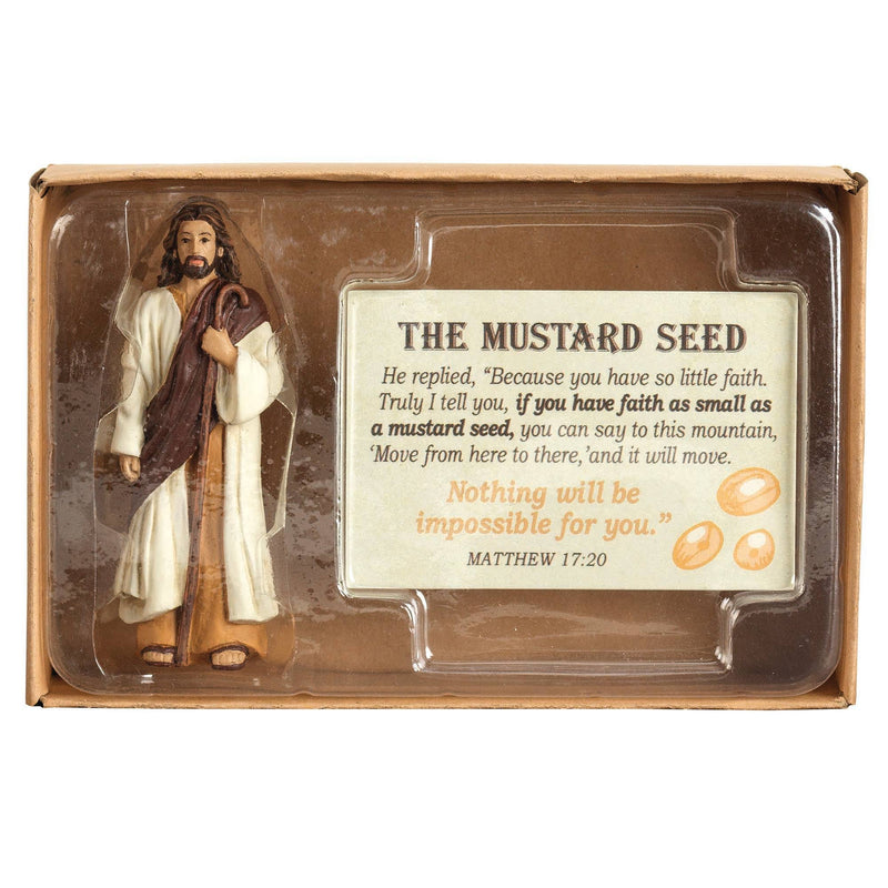The mustard seed itty bitty blessings Jesus figurine with card in gift box this 3" high Jesus figure is accompanied by an inspirational card in this gift boxed set. The figure, made of resin, is just the right size to place anywhere you will see it often.