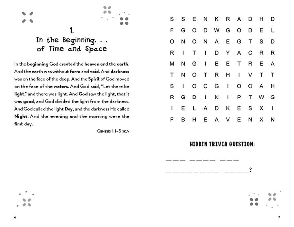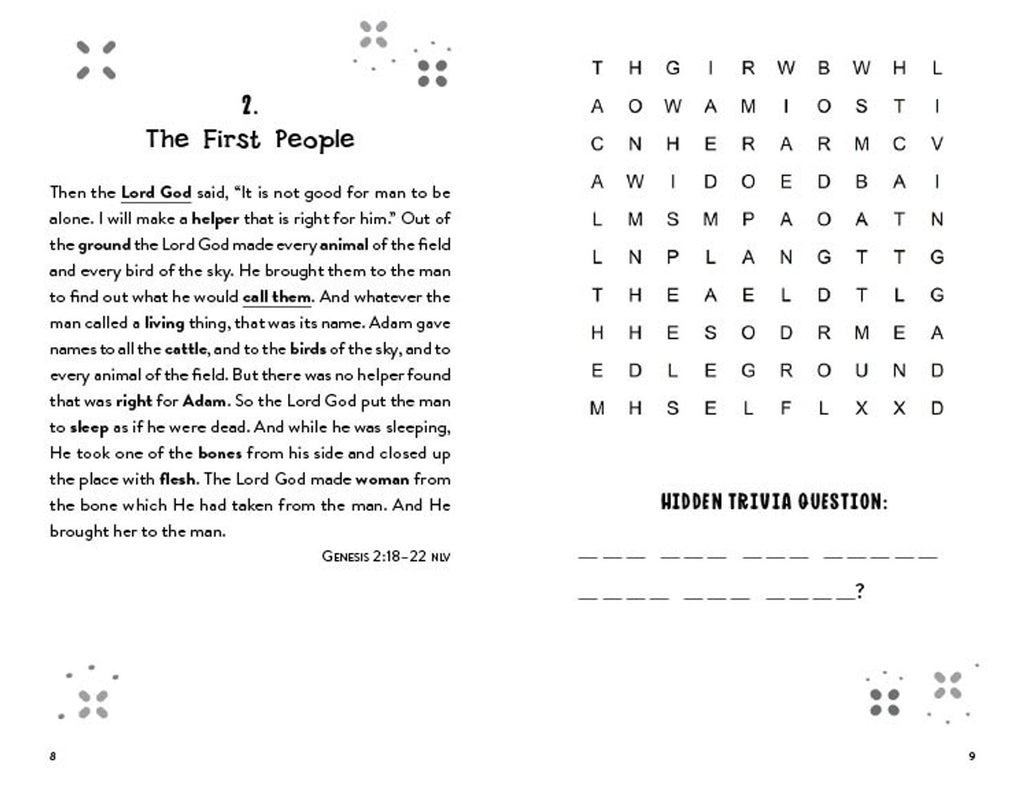 of God’s Word. First, you’ll find the 13–18 search words in the puzzle grid. Then you’ll read the leftover letters for a related Bible trivia question. Kids’ Hidden Trivia Bible Word Searches is a great way to turn “down time” into something great!