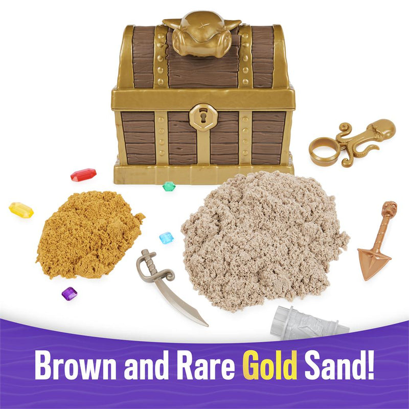 - 2 STYLES OF KINETIC SAND: Search for the key to unlock the chest and lift the lid to find 16oz of brown sand inside! Discover 4oz of rare gold Shimmer Kinetic Sand on the bottom!