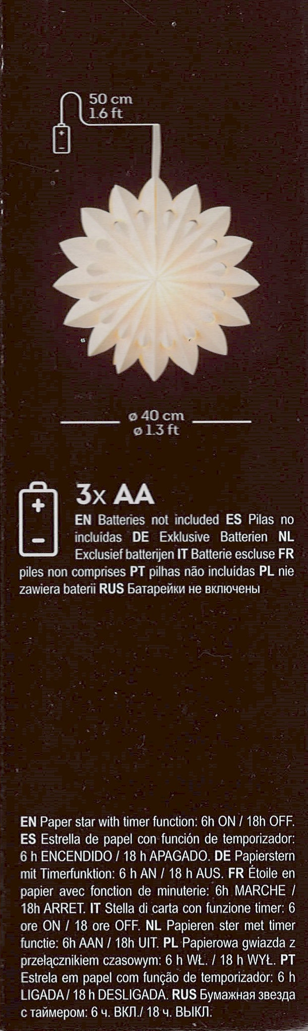 Equipped with six warm white LEDs, the star adds a cozy ambiance to your environment. Its convenient timer function allows for 6 hours of illumination followed by 18 hours off, ensuring effortless operation. Hang it in your living room, kitchen, or entryway to create a magical atmosphere that enhances your holiday celebrations and delights guests with its shimmering beauty!