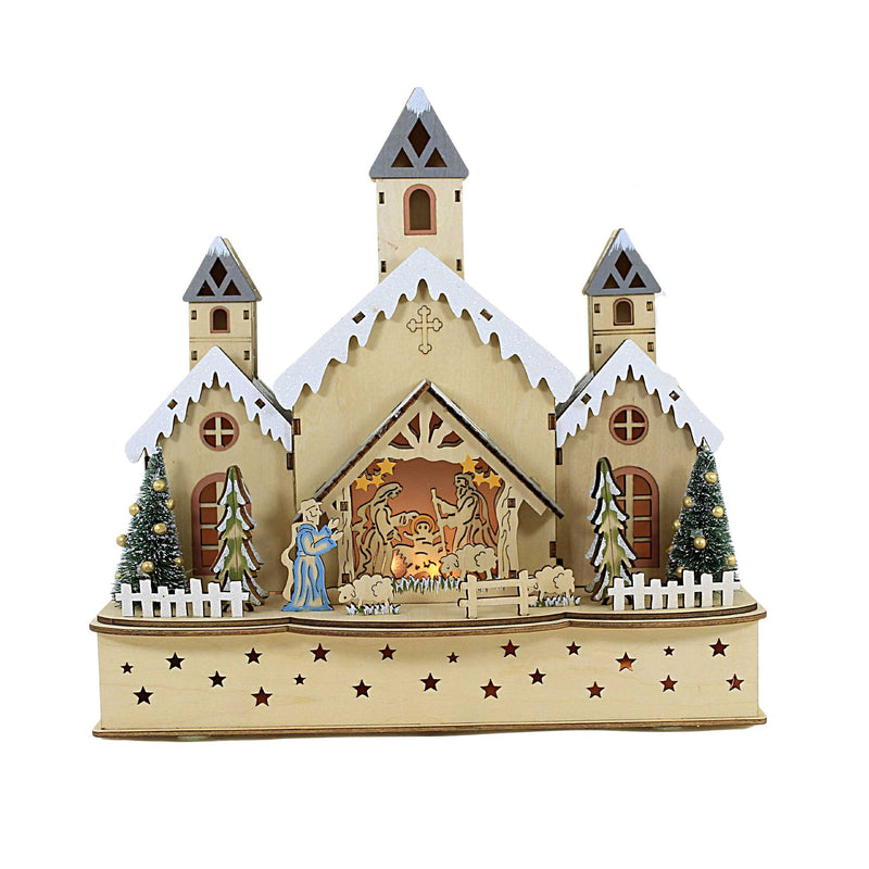 A Lighted Balsam Wood Laser Cut Snow Covered Church Embellished With A Manger Scene Which Is Highlighted By A Light. With A Farm House And Barn Accented With Sparkling Snow. Various Sizes Of Snow Capped Pine Trees Embellish The Farm Land. Lights Accent The Barn, Lantern And The Backs Of The Pine Trees.