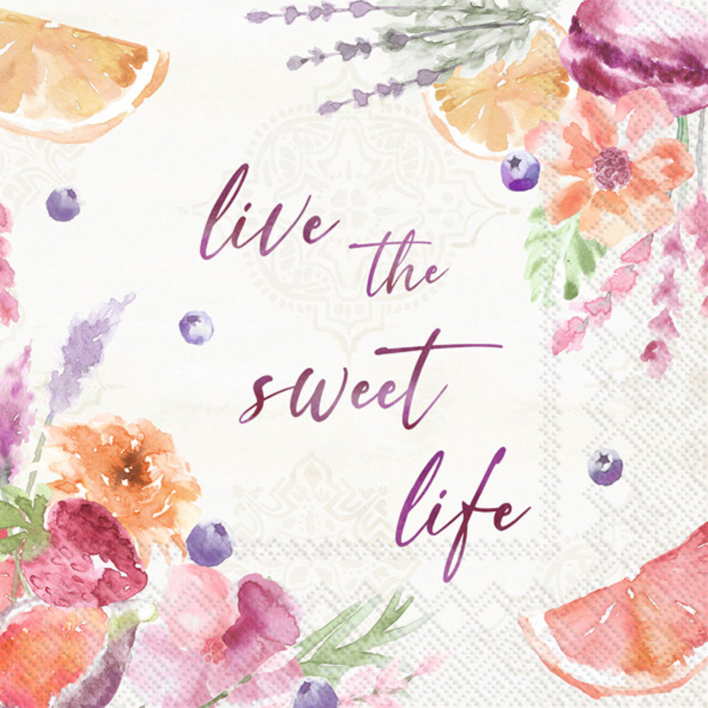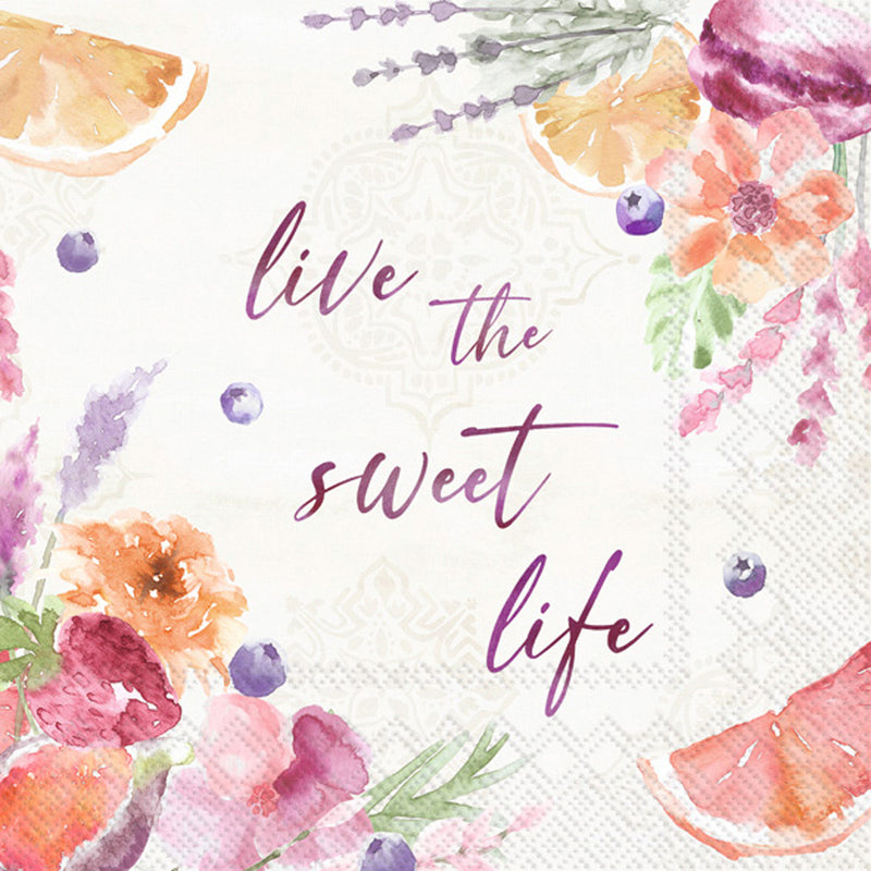 Add a touch of charm and sweetness to your next gathering with our delightful Lete Cream Cocktail Napkins! Each package contains 20 vibrant three-ply napkins, each measuring 5 inches by 5 inches when folded. Featuring a beautiful design adorned with colorful florals and the uplifting phrase "live the sweet life," these napkins are perfect for enhancing your table decor during brunches, parties, or casual get-togethers.