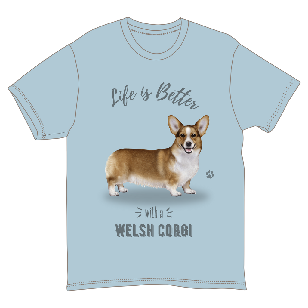 This delightful t-shirt, made from 100% soft cotton, features a charming illustration of a Welsh Corgi along with the phrase "Life is Better with a WELSH CORGI." Its cheerful light blue color and unisex design offer both style and comfort, making it perfect for casual outings or cozy days at home.