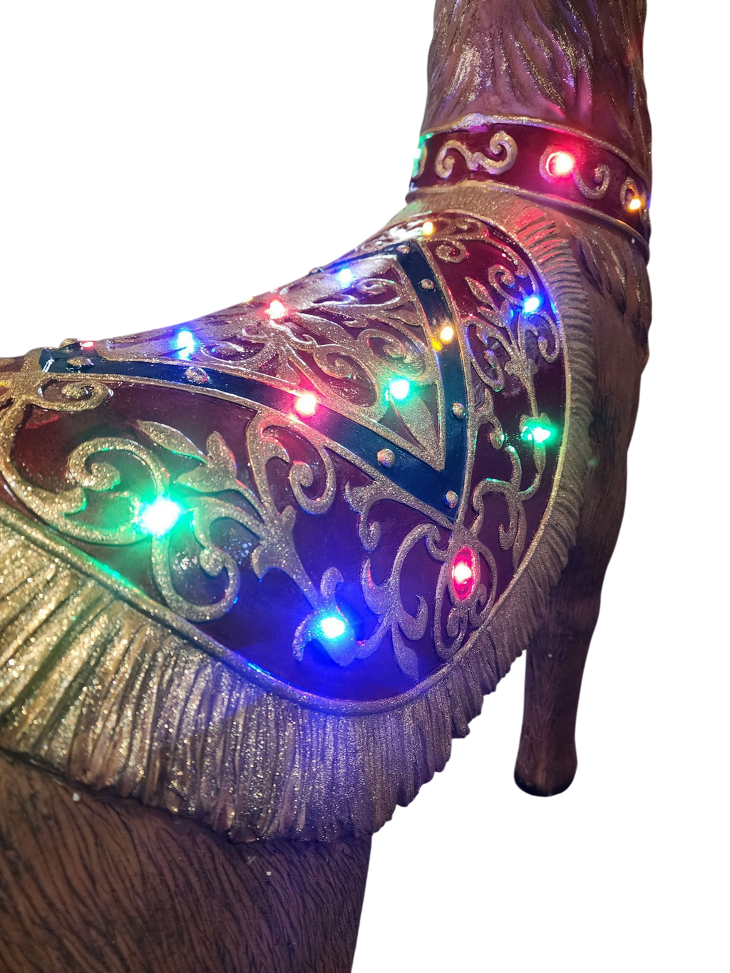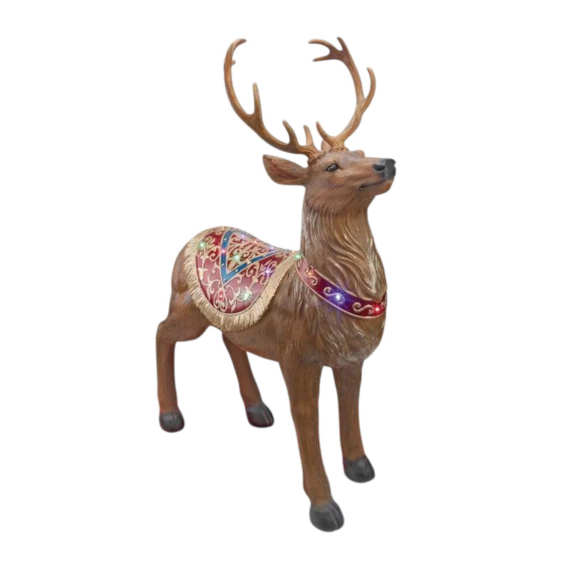 Bring a touch of whimsy and cheer to your holiday décor with this enchanting 48-inch Lighted Reindeer Statue from Season's Design. Perfect for both indoor and outdoor display, this beautiful piece is hand-cast using crushed stone and bonded with high-quality designer resin, ensuring it can withstand the elements while keeping your festivities bright. With its intricately hand-painted details and a vibrant saddle adorned with colorful embellishments, this reindeer is ready to become the star of your holiday scene.