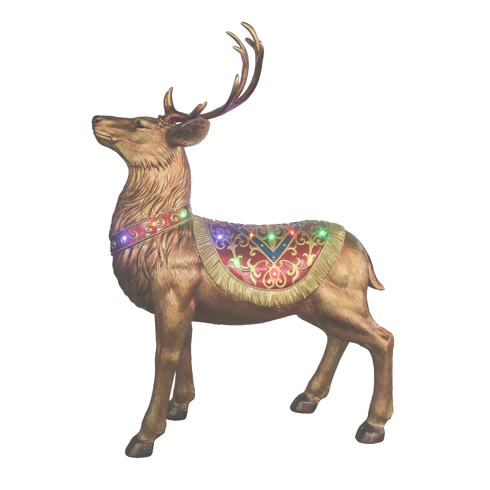 Bring a touch of whimsy and cheer to your holiday décor with this enchanting 48-inch Lighted Reindeer Statue from Season's Design. Perfect for both indoor and outdoor display, this beautiful piece is hand-cast using crushed stone and bonded with high-quality designer resin, ensuring it can withstand the elements while keeping your festivities bright. With its intricately hand-painted details and a vibrant saddle adorned with colorful embellishments, this reindeer is ready to become the star of your holiday scene.
