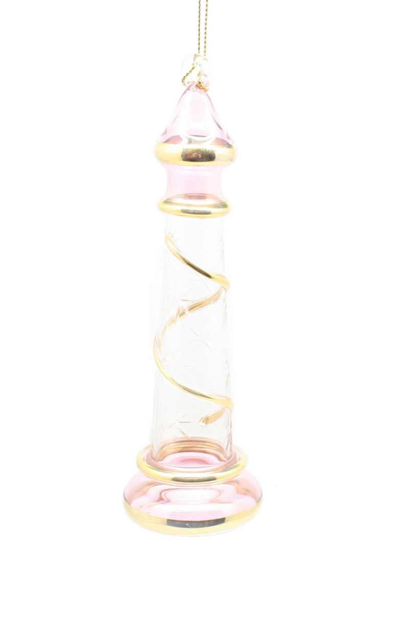 Illuminate your holiday decor with the astonishing Golden Lighthouse Ornament, a true testament to the artisanal craftsmanship of mouth-blown glass from Egypt. Measuring just over 6 inches tall and about 2 inches wide, this exquisite piece showcases a stunning spiral design adorned with real 24K gold accents. Each ornament is carefully handcrafted, ensuring that no two pieces are exactly alike, making it a truly one-of-a-kind addition to your seasonal collection.