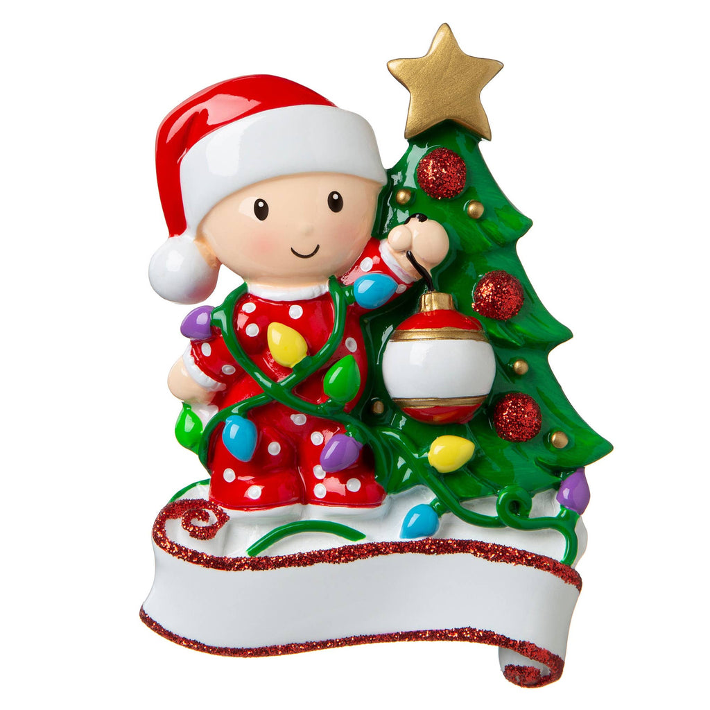 Celebrate the spirit of the season with the adorable Jolly Holiday Elf Ornament! This charming ornament features a cheerful little elf dressed in festive red pajamas, joyfully wrapped in colorful Christmas lights while adorning a beautifully decorated green Christmas tree. Topped with a golden star and holding a shiny ornament, this delightful piece is crafted from durable resin and measures approximately 4 inches tall by 3 inches wide, making it the perfect addition to your holiday tree or a thoughtful gift for children celebrating the season.