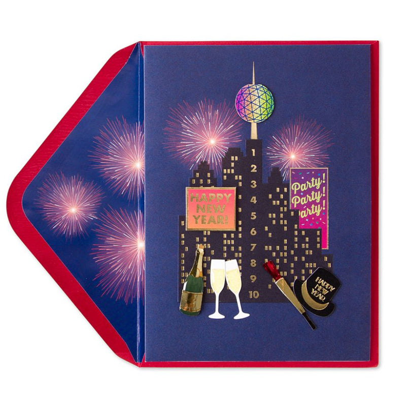A collage of New York City buildings, signs, champagne glasses, a hat and a sound maker is depicted on this New Year's card complete with gold foil and tip-ons.