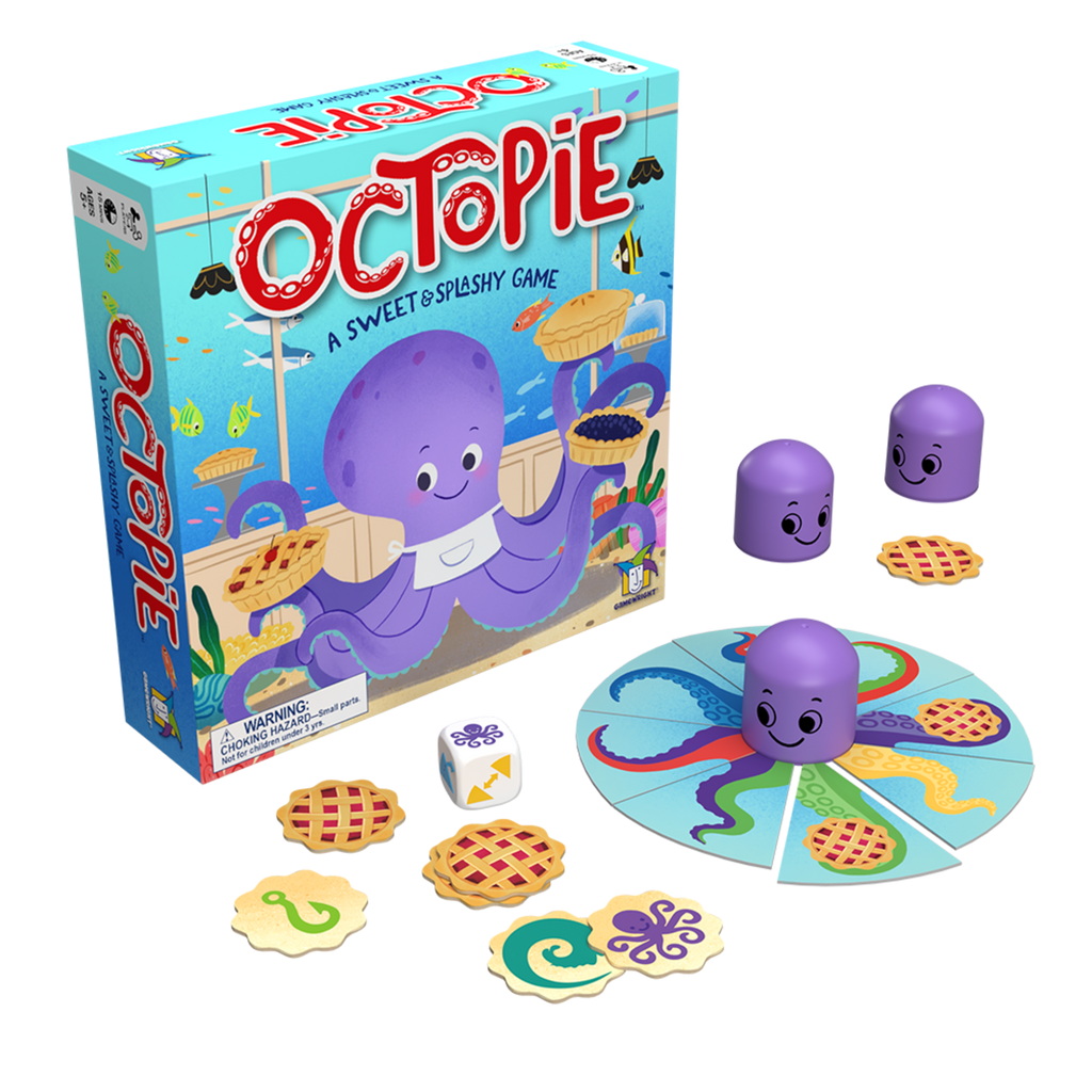 OctopieA Sweet & Splashy GameIt's an undersea race to gather eight matching arms for your octopus! Roll the die to see if you will draw from the octo-pile, flip over a tile to reveal the color lying beneath, or even swap with an opponent. Find an arm holding a pie, and you get a tasty extra action to help win the race. Be the first to complete your octopus and win first pies!