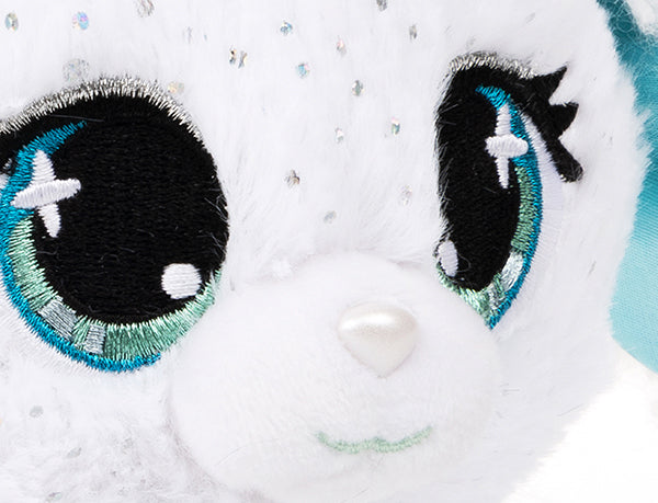 Bling brunch on! Bianca Blings is always ready for a mid-day, Mid-town brunch with the girls in Manhattan, where she struts her sparkly self like she owns the street. This precocious pup loves a good gossip sesh and wags her fluffy tail when the goss gets juicy! Her dainty white fur is flecked all over with her favorite diamond-inspired sparkles, and because she can never get enough bling, her sparkling teal eyes match her stain bow, glittering collar, and super fluffy ears.