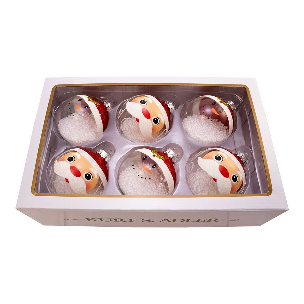 These Kurt Adler Clear and White Santa and Snowman Glass Ball Ornaments are a beautiful addition to any holiday décor or Christmas tree. This clear ornament set features Santa Claus and snowman design, both wearing traditional Santa hats. The ornaments are filled with faux snow adding a fun and festive twist to the traditional ornament.