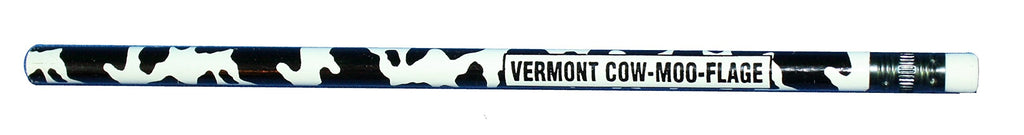 Wooden pencil with cow print and the words 'Vermont Cow-moo-flage' printed on.