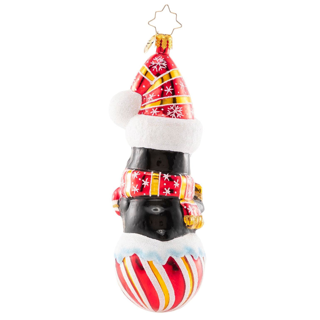This tiny penguin friend smiles from her perch atop a peppermint candy ball in a swirly Santa hat and matching scarf. She's looking minty, merry and marvelous!