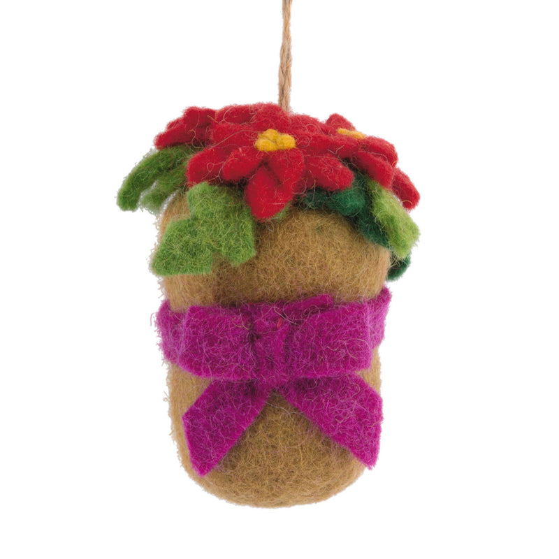 Make your holiday decor blossom with festivity when you hang this pretty Christmas tree ornament. The plush felt design features a pretty arrangement of potted poinsettias finished with a magenta bow. Perfect for your favorite gardener.