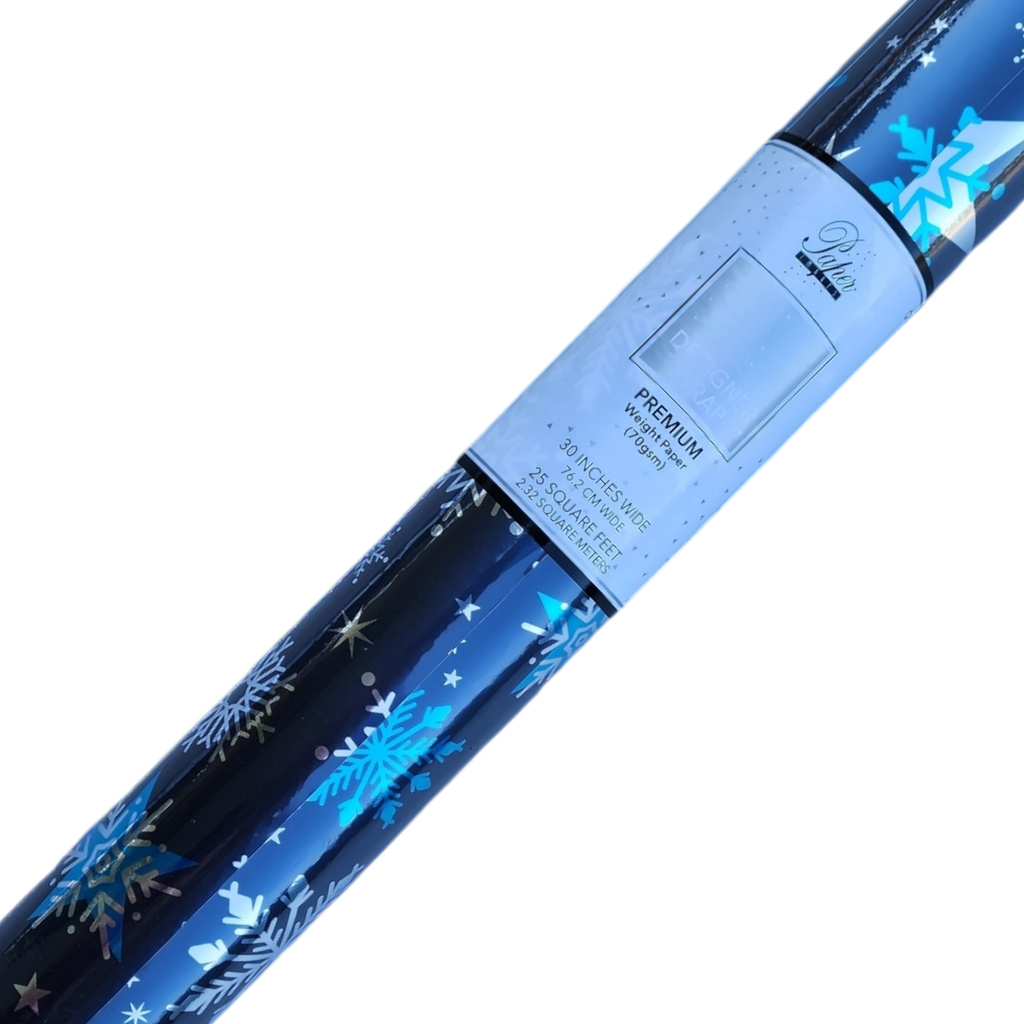 Bring the allure of a winter wonderland to your holiday gifts with Icy Night Snowflake Gift Wrap. This premium wrapping paper features striking blue and silver snowflakes, intricately designed and set against a deep, midnight blue background. The varying sizes and styles of snowflakes, along with delicate stars, create a mesmerizing pattern that captures the beauty and tranquility of a frosty winter night. Measuring 30 inches wide and 120 inches long, this generous roll provides plenty of material to wrap gifts of all sizes with a touch of sophistication and festive charm.
