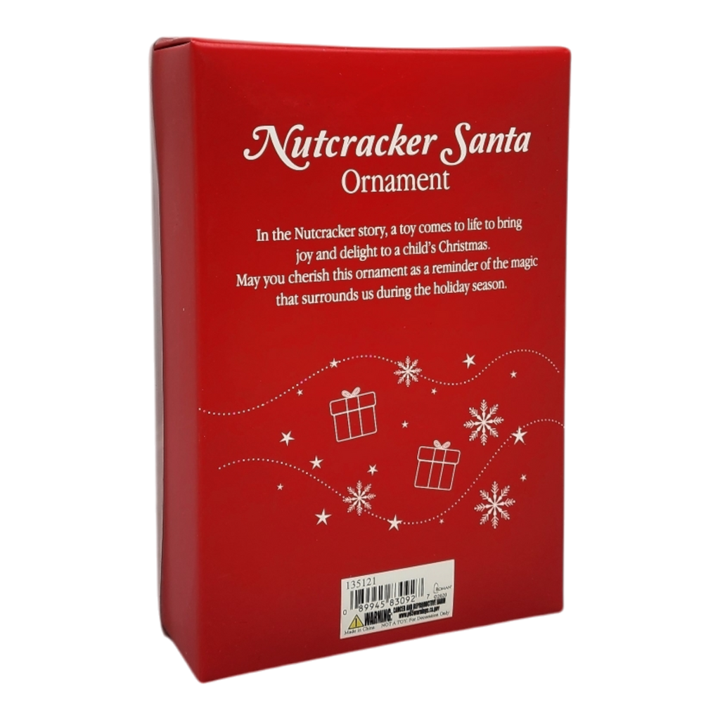 Handpainted resin ornament depicts a nutcracker dressed as Santa, complete with bag of toys and a stuffed teddy bear.
