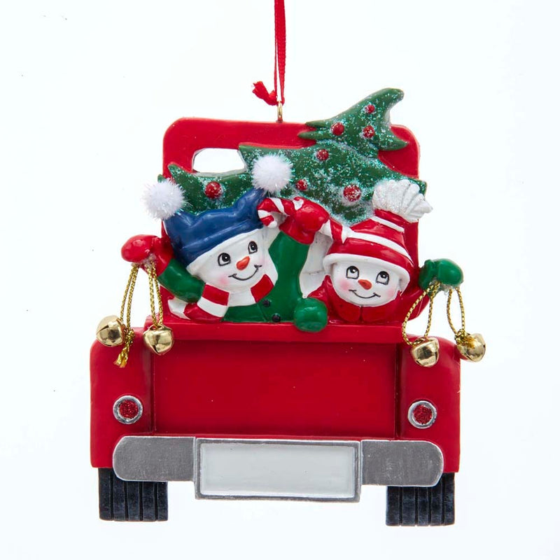 Spread some holiday cheer with this personalized resin ornament! Featuring a festive red truck filled with two snowmen, it's sure to bring a smile to anyone's face. Make it extra special by customizing it with your own unique message!