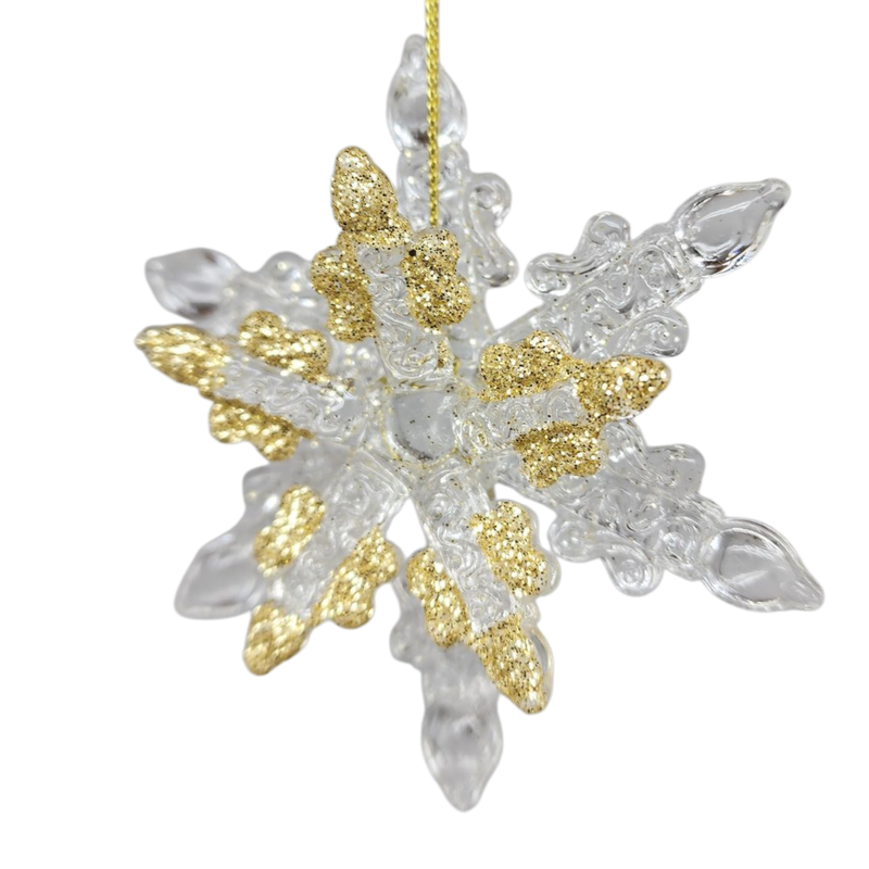 Celebrate the sparkling beauty of winter with this exquisite spun glass snowflake ornament, measuring around 3 inches tall. Featuring intricate clear glasswork accented with dazzling gold glitter details on the tips and inner patterns, this ornament captures the delicate and unique charm of a real snowflake. Snowflakes have always been a symbol of winter’s magic and wonder, making this ornament a perfect festive addition to your Christmas tree or seasonal décor.