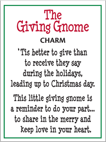 The Giving Gnome is not designed for attaching to jewelry; instead, it serves as a thoughtful pocket charm or a meaningful gift for loved ones. Slip it into a holiday card, set it on a mantle, or keep it close in your pocket as a reminder to cherish the true spirit of the holidays. With its cheerful spirit and heartfelt message, this little gnome will inspire you and those around you to share love and kindness throughout the festive season and beyond!