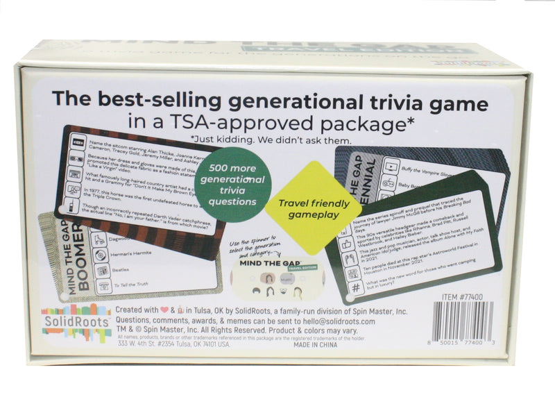 Get ready for a road trip adventure filled with laughter and friendly competition with the Mind The Gap - Travel Edition! This portable trivia game is designed for ages ten and up, making it the perfect activity for families and friends on the go. With 500 questions that span generational knowledge, players can test their wits and discover how well they bridge the gaps between different age groups. Packed in a TSA-approved travel-friendly package, this trivia game is easy to take along wherever your adventures lead!