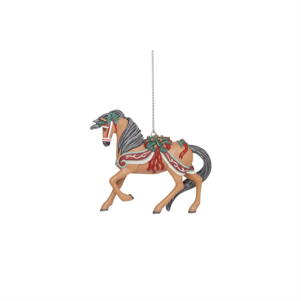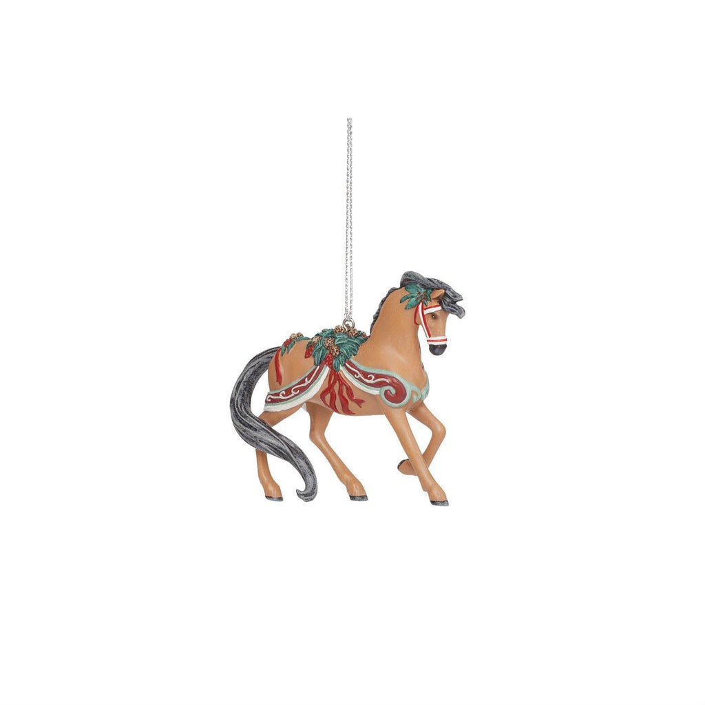This delightful ornament, titled "'Tis the Season," is a wonderful creation by designer Emily Overman. Capturing the festive spirit of the holidays, this piece stands as an enchanting addition to any holiday decor. Approximately 2.7 inches tall, the ornament features a charming tan horse adorned in festive holiday decorations.