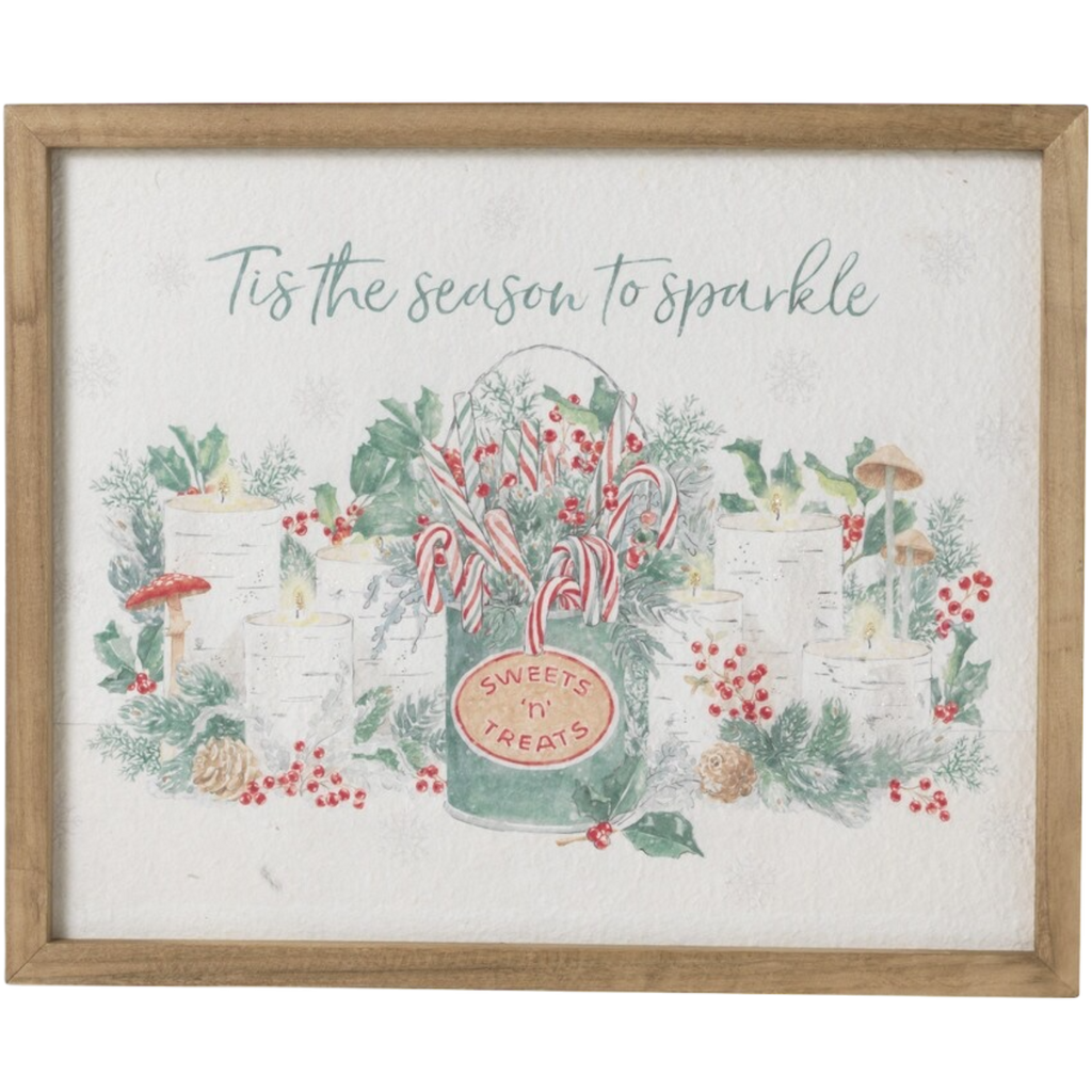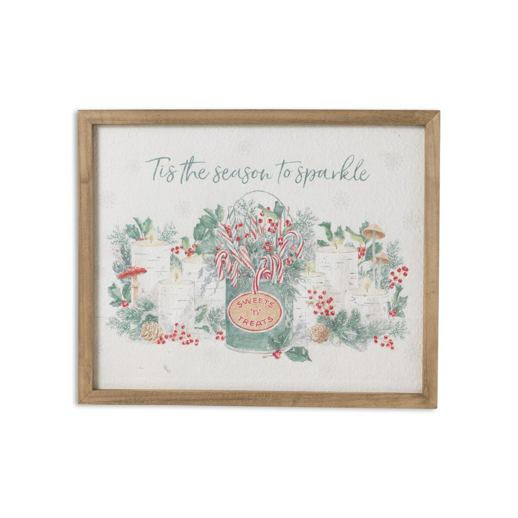 Infuse your home with festive charm using our delightful 'Tis the Season to Sparkle Wall Art! Measuring 19.75 inches wide by 16.25 inches tall, this beautifully designed piece features a textured print adorned with rich holiday imagery, including candy canes, seasonal greenery, and cheerful décor that enhances your festive ambiance. The sparkling glitter accents add a touch of magic, making it a captivating focal point for your holiday decorations.